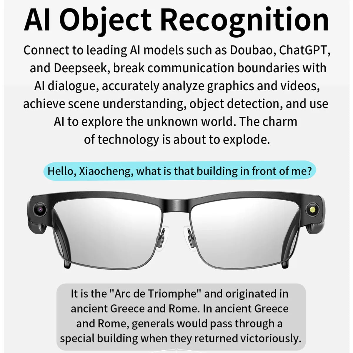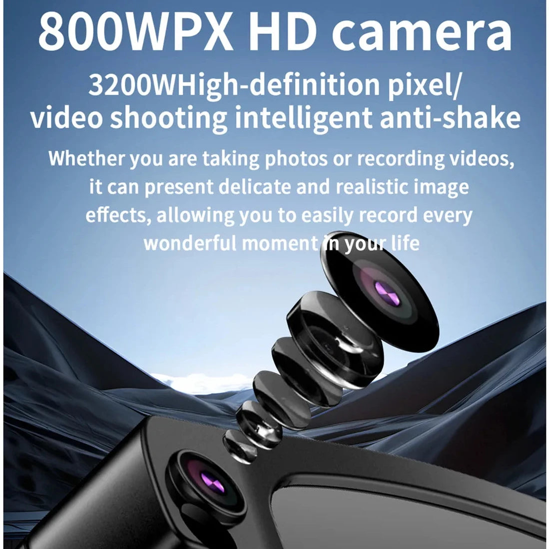 8million high-definition camera, anti-shake +1200P high-definition video recording, dual microphone noise reduction system, recording, wiff+ Bluetooth real-time transmission, wearing detection, music control, voice assistant, Bluetooth call, large battery 270mAh, high-definition speaker sound quality, object recognition, intelligent AI, multilingual translation, etc.